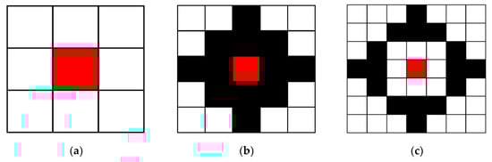 where ws is the sub-set of points of the conversion window. We can see that the sparse census transform takes a part of the points to convert instead of all the points in the window. According to the results of the sparse census transform [], the neighbor points are selected to be symmetric. The 16-points are selected with a 7 × 7 window as shown in Figure 6c, which maximizes the performance. In this paper, the same pattern of Figure 6c is used and expanded for the selected points to the different windows. The selected points with different windows are shown in Figure 6. In this section, the sparse census transform is combined with AWCT. The flowchart of AWSCT is the same as AWCT (Figure 4), but the CT is changed to SCT (sparse census transform).