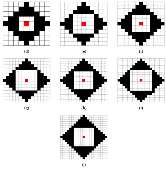 The selected points in the windows with a sparse census transform. (a) AWSCT 3 × 3, (b) AWSCT 5 × 5, (c) AWSCT 7 × 7, (d) AWSCT 9 × 9, (e) AWSCT 11 × 11, (f) AWSCT 13 × 13, (g) AWSCT 15 × 15, (h) AWSCT 17 × 17, (i) AWSCT 19 × 19, and (j) AWSCT 21 × 21.