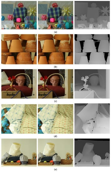 - Scharstein, D.; Hirschmuller, H.; Kiajima, Y.; Krathwohi, G.; Nesic, N.; Wang, X.; Westling, P. High-Resolution Stereo Datasets with Subpixel-Accurate Ground Truth. In Proceedings of the German Conference on Pattern Recognition, Münster, Germany, 3–5 September 2014. [Google Scholar]