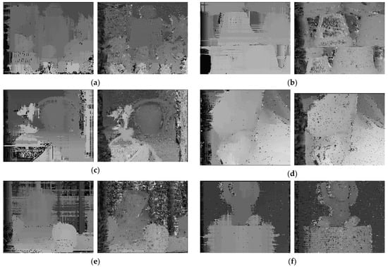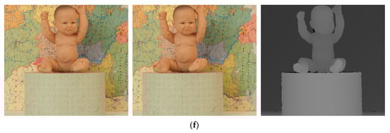 Six images (Moebius, Flowerpots, Reindeer, Cloth2, Midd1, and Baby1), which were provided by Middlebury Stereo Datasets [], were used to show the performances of the proposed methods. These six images and their ground truth are shown in Figure 7.