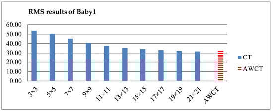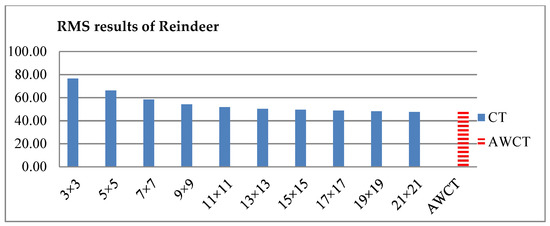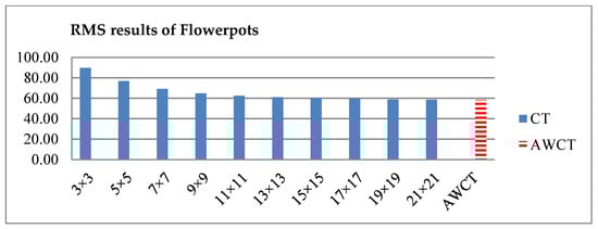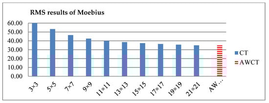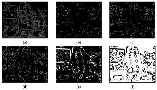 The results of Moebius by AWCT are shown in Figure 9. The edge detection result is shown in Figure 9a. The main idea of the AWCT is that the windows can be adapted. The worst option is to select the largest window size. In order to show the worst case for the size of each window, the pixels which are adapted to the largest windows size in 13 × 13, 15 × 15, 17 × 17, 19 × 19, and 21 × 21 are set as white and shown in Figure 9b–f, respectively. We can observe that when using a 13 × 13 and 15 × 15 window size, not all edge areas are applied to the largest window. At a 17 × 17 and 19 × 19 window size, the largest window was used for almost all edge points. Similar experimental results of Flowerpots, Reindeer, Cloth2, Midd1 and Baby1 are also shown in Figure 10, Figure 11, Figure 12, Figure 13 and Figure 14, respectively. The results of six images with RMS are shown in Figure 15, Figure 16, Figure 17, Figure 18, Figure 19 and Figure 20, respectively. These results show that AWCT’s RMS is equivalent to the results of the largest windows (7 × 17, 19 × 19 or 21 × 21) with CT. The detailed results of AWCT and the results of CT with the largest window are listed in Table 2. According to the results, we can see that when we use the windows sizes with 13 × 13, 15 × 15, 17 × 17, or 19 × 19, the number used of the largest window is significantly less. This means that the AWCT can effectively adjust the window size and reduce the number of the largest windows. The results also show that the accuracy (PoBMP and RMS) of AWCT is similar to that of CT, but the reduction ratio of the operation number of calculation points (total pixels are calculated in Equation (3)) is about 4%–7%.