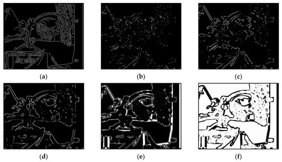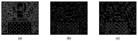 The boundary information can be extracted by edge detection and regarded as a result of high-pass filtering. The result of edge detection is mainly used to highlight whether the image is an area where the pixel changes significantly. In this study, the boundary information is used to classify and determine the complexity in the vicinity of the pixel. If the gray scale intensity changes significantly, a smaller conversion window can be used; otherwise, if the gray scale intensity of the area near the pixel does not change significantly, a larger conversion window must be used. In this paper, the Canny edge detection method is used for boundary detection [,]. First, the noise must be filtered by a two-dimensional Gaussian filter. The Gaussian function can be described as