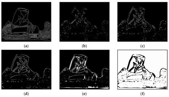 The conversion window sizes can be 3 × 3, 5 × 5, 7 × 7, …, 21 × 21. After the edge detection, each point will be the center of the windows in turn, and we count the number of edge points in each window. We also count the proportion of the number of edge points in the window. The window size ranges from small to large, and the size is selected when the window contains edge points. We divide the window size selection into two types. The first type is no edge, in which there are no edge points in the window. The image texture representation in this area is unclear, even without texture. The largest window size is used in this type. The other type is one in which the edge points are in the window. In this type, we record the proportion of edge points in the window when the window changes from small to large. We record it as one-time negative growth when the window size increases by one level and the ratio decreases. The window size will be selected when we have negative growth N consecutive times. In this study, the value of N is set to 5 through experience. This value can be set by the user for different cases.
