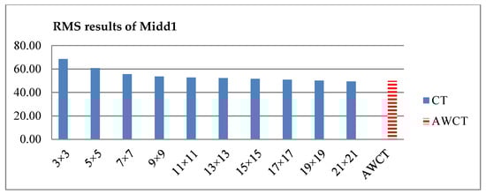 The results of Midd1 by AWCT. (a) Edge information and schematic diagrams of the biggest window size in (b) 13 × 13, (c) 15 × 15, (d) 17 × 17, (e) 19 × 19, and (f) 21 × 21.