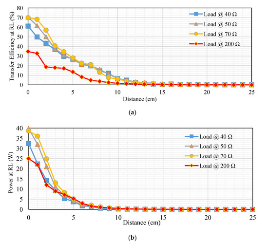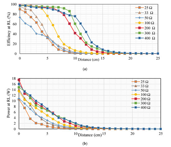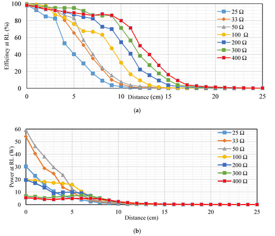 Figure 17a, indicates the measured transfer efficiency at RL. The transfer distance in centimeters is plotted on the x-axis and the transfer efficiency in percentage plotted on the y-axis. The transfer efficiency into 100 Ω was high compared with other resistive loads at distances 1–2 cm, ranging from 99.03% and 97.6%. The transfer efficiency into 300 Ω was high compared with other resistive loads at distances 3–7 cm, which ranged from 95.07%, 95%, 94.93%, 91.55% and 86.63%. The transfer efficiency into a 400 Ω load was high compared with other resistive loads at distances 8–25 cm, which ranged from 87.84%, 86.27%, 80%, 71.37%, 50.4%, 40%, 27.2%, 16.2%, 9.2%, 4%, 2.88%, 1.8%, 1.3%, 0.96%, 0.6%, 0.54%, 0.32% and 0.28%. Furthermore, the transfer efficiency into a 25 Ω load was low compared to other resistive loads at distances 1–25 cm, ranging from 92.44%, 85.03%, 82.55%, 53.26%, 40.33%, 29.41%, 17.54%, 9.07%, 3.73%, 2.13%, 1%, 0.53%, 0.28%, 0.27%, 0.22%, 0.18%, 0.18%, 0.13%, 0.06%, 0.05%, 0.05%, 0.04%, 0.04%, 0.04% and 0.03%. The remainder of the values fell between these values. Figure 17b, indicates the measured transfer power at different resistive loads. The transfer distance in centimeters is plotted on the x-axis, and the transfer power at RL in percent is plotted on the y-axis. The transfer power into a 50 Ω load was high compared with other resistive loads at distances 1–4 cm, ranging from 46.41, 38.07, 29.6 and 23.45 W. Whereas the transfer power into 400 Ω was low compared with other resistive loads at distances 1–5 cm, which ranged from 5.04, 4.18, 4.1, 4.73 and 4.84 W. The transfer power for a 100 Ω load was high compared with other resistive loads at distances 5–6 cm, ranging from 15.8 and 10.4 W. The transfer power into a 25 Ω load was low compared with other loads at distances 6–25 cm, which ranged from 4, 2.48, 1.5325, 1.05, 0.672, 0.455, 0.345, 0.198, 0.15, 0.0915, 0.068, 0.0495, 0.04, 0.025, 0.021, 0.0132, 0.009, 0.007 and 0.005 W. The rest of the values fell between these values.