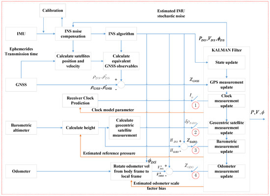 17]. The research of combining barometric with GPS/INS/odometer is rather limited. Chiang et al. simply treats the barometer height as a measurement in the KF in the INS/GNSS/odometer/barometer integration system [