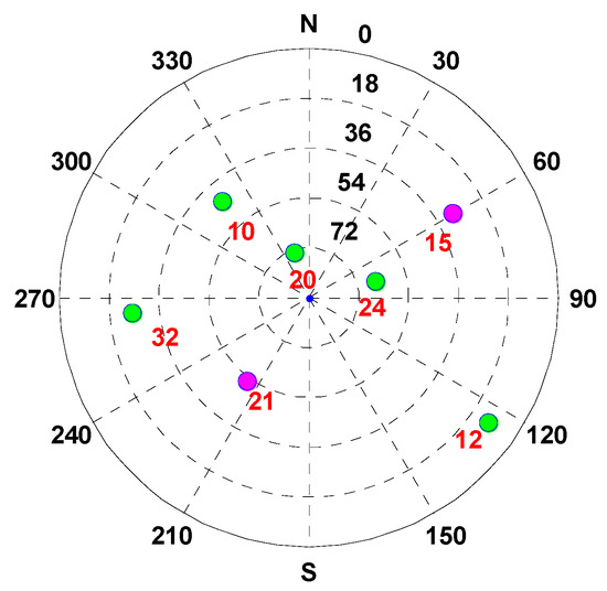 Figure 13, the remaining visible satellites are presented by magenta dots for the epoch of 2000 s. The position and velocity errors of the MTF method in the east, north, and up directions are shown in