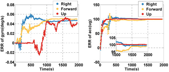 Table 2) in about 250 s. The convergence time of error in the up direction is much longer, about 1000 s, which is related to orientation. For the accelerometer, the error in the up direction, which is related to height, converges to the final value (100 ug, shown in