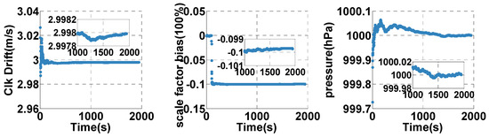 The estimated clock drift, error of the odometer’s scale factor, and reference pressure are shown in