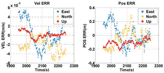 Figure 3, the remaining visible satellites are presented in red circles for the epoch of 1950 s. The position and velocity errors of the MTF method in the east, north, and up directions are shown in