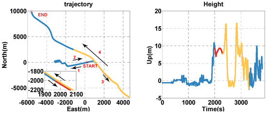 Figure 12, and the vehicle is driven along the 1-2-3-4 arrow indication. To analyze the performance of the MTF method in different contexts, the test time is divided into: during 0–1999 s and 3300–3803 s, the vehicle is in the open-sky context, and the visible satellites number is almost more than 4. During 2000–2299 s, the vehicle is in the insufficient satellite context, and two satellites are left, simulating when the GNSS signal is obscured by the building on one side of the road. In