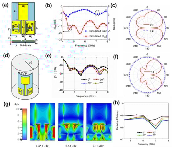 The simulated |S11| using CST STUDIO SUITE of the optimized antenna is plotted in Figure 2b. It can be seen that the |S11| of the antenna has a −10 dB bandwidth from 4.3 GHz to 8.0 GHz, indicating a relative bandwidth of 60% with a maximum gain of 4.7 dBi. Figure 2c shows the simulated far-field radiation patterns of the antenna at 5.6 GHz, demonstrating a low backward radiation. In order to explore the performance of the antenna under bending conditions, electromagnetic simulations were carried out to determine the performance change of the antenna under various bending angles (θ) with the simulation model shown in Figure 2d. The overall spectrum shape of the simulated |S11| curves under different bending angles of θ = 0°, 30°, 60°, and 75° remains unchanged as depicted in Figure 2e, which indicates that the performance of the antenna is pretty robust against the effect of bending. It is worth noting that as the antenna bends, the shapes of the radiator and the ground change accordingly. This results in a different radiation pattern as we can see in Figure 2f, where we achieve better directionality with the antenna bending at θ = 60°. In order to investigate the effects of the H-shaped slot in realizing ultra-wide bandwidth, the vector plots of current distribution of the suggested antenna at three different frequencies are displayed in Figure 2g. The surface current mainly distributes at the patch edges and the H-slot of the ground plane along the y-axis. This indicates that the portion of the ground plane that is close to the patch can be considered as a part of the radiating structure. Therefore, adding slots enhances the radiation performance. As can be seen in Figure 2g, the surface current density is noticeably increased at the feed line at 7.1 GHz, indicating the significant effect of the feed line at high frequency. Figure 2h is the simulation result of the radiation efficiency of the antenna. It can be seen that as the bending angle increases, the radiation efficiency gradually decreases.