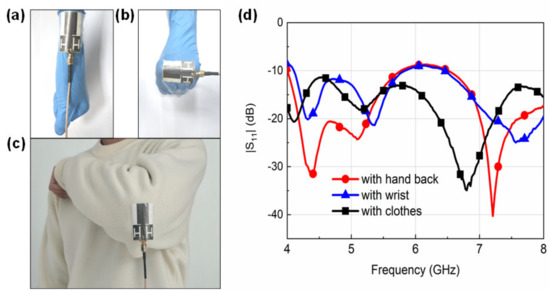 For a wearable antenna, the effect of the human body and clothes should also be considered since these devices often need to work in close proximity to a human body. To test the feasibility of the proposed GAF antenna for wearable devices and smart clothing, we measure the reflection coefficients (|S11|) of the fabricated antenna under different application scenarios as shown in Figure 4a–c. The |S11| responses corresponding to the situations in Figure 4a–c are depicted in Figure 4d. When the antenna is conformed to the object’s wrist and arm in the bent condition, the impedance matching of the antenna is affected. The upper frequency resonance point of the antenna when on the wrist shifts to 7.5 GHz, and the mid-frequency resonance point of the antenna when attached to the back of the hand shifts to 5.2 GHz. When the antenna is integrated with clothes, the −10dB bandwidth of the antenna widens and the resonance point shifts left. Though the resonant frequencies of the antenna shift dramatically under different scenarios, the UWB characteristic of the proposed antenna ensures consistent performances with |S11| values lying below −10 dB within the operational range for on-body applications.