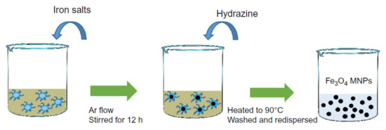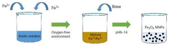 A schematic of the synthesis of iron oxide magnetic nanoparticles using the co-precipitation method [26]. In this example, the precursors (Fe2+/Fe3+ chlorides, sulfates, or nitrates) are dissolved in an acidic solution. Then, a strong base is added to increase the pH > 8 in a non-oxidizing environment.