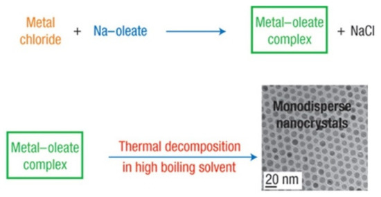 A schematic for magnetic nanoparticles preparation using thermal decomposition technique. Metal–oleate precursors were prepared from the reaction of metal chlorides and sodium oleate. The thermal decomposition of the metal–oleate precursors in the high boiling solvent produced monodisperse nanocrystals [30].