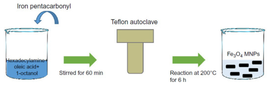Hydrothermal and solvothermal syntheses employ various wet-chemical techniques to form crystalline magnetic nanoparticles. Figure 4 shows a schematic of the hydrothermal method, where the process is carried out in high-pressure reactors or autoclaves to reach high pressures at high temperatures. This method uses either aqueous or non-aqueous solutions at high temperatures under high pressures to avoid the growth of dislocations in single crystal magnetic nanoparticles [30]. As a result, this method is suitable for the growth of crystalline phases that are unstable around their melting temperature. Furthermore, this method facilitates the growth of the magnetic nanoparticles that have a very high vapor pressure at their melting points while maintaining good control over the magnetic nanoparticles’ compositions [31]. This method is especially beneficial for the synthesis of hollow and controlled shape magnetic nanoparticles [32] including nanotubes and nanorings. It should be mentioned that this technique is very sensitive to the synthesis temperature as it can dramatically impact the reaction kinetics and nucleation rate [33].
