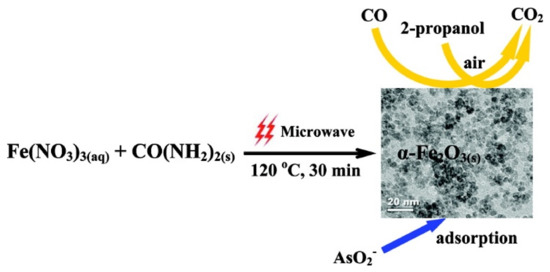 A schematic of magnetic nanoparticle preparation using the microwave-assisted technique at a temperature of 120 °C using a mixture of ferrite-nitrate and urea aqueous solution [47].