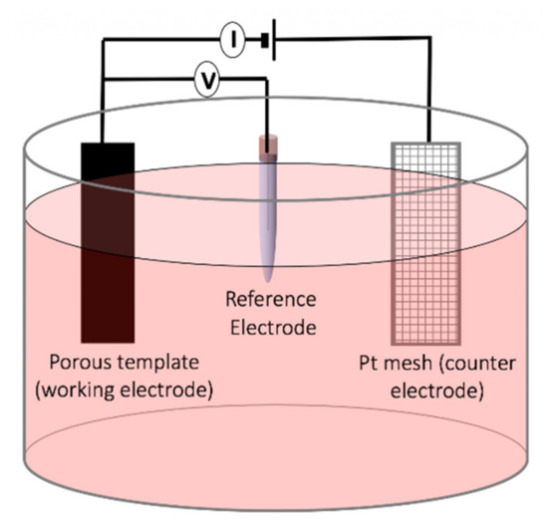 A schematic showing the synthesis of magnetic nanowires using a template-assisted electrodeposition technique [54]. After making the electrical contacts, the template is placed at anode and a platinum mesh is used as counter-electrode. The deposition current and voltage are controlled using the reference electrode, where the electric field between the working and counter electrodes forces the free ions to be deposited in the pores.