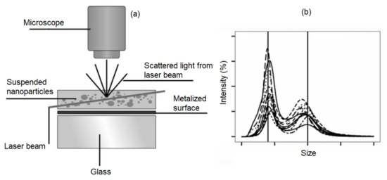 A schematic of the nanoparticles tracking analyzer [85]. (a) NTA employs a high speed camera to capture the light scattered by the Brownian motion of nanoparticles to determine the nanoparticles size distributions, and (b) is an example for a sample including two size distributions.