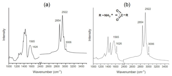 - Rudolph, M.; Erler, J.; Peuker, U.A. A TGA–FTIR Perspective of Fatty Acid Adsorbed on Magnetite Nanoparticles–Decomposition Steps and Magnetite Reduction. Colloids Surfaces a Physicochem. Eng. Asp. 2012, 397, 16–23. [Google Scholar] [CrossRef]