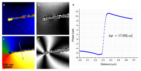 An exemplary experimental result showing magnetic nanowires captured using the electron holography technique [120]. (a,b) are the electrostatic phase and its amplification, respectively. (c,d) are the magnetic phase and its amplification. (e) is the phase shift across the arrow in (c).