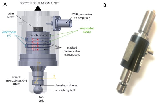 Ultrasonic vibration-assisted ball-burnishing (UVABB) tool equipped with a 1D linear displacement system through piezoelectric stack designed by Jerez-Mesa et al. (2018) [20]. (A) General scheme of the piezoelectric system; (B) Real image of the prototype used for vibration monitoring.