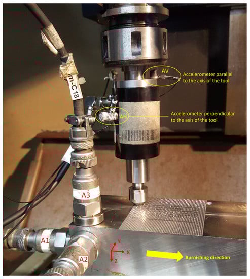 The higher amplitudes of the signals measured by accelerometers A1 and A2 are justified by the interference that the workpiece’s surface performs on the tool as it moves on it to perform plastic deformation. In the vertical direction (accelerometer A3), that movement is constrained by the compression load of the UVABB on the tool, and for that reason it presents a lower magnitude.