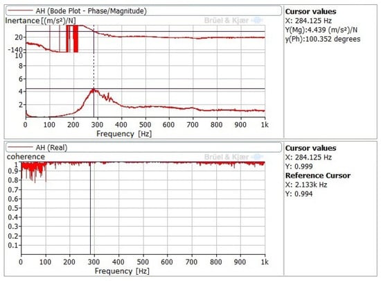 The natural frequencies found for the UVABB tool, and resulting from processing the signal registered by accelerometers AH and AV (Figure 4A,B), are presented in Table 4. Values not included in the table are missing due to the fact that they were not excited during the tests. These values evidence that, by changing the load exerted on the workpiece surface changes the rigidity of the system and, therefore, its natural frequencies. However, it can also be seen that these values are not sensitive to piezoelectric excitation, i.e., there is no modal change during a UVABB process compared to an NVABB operation. All values were deduced from the frequency response functions (FRF) and Bode diagrams to confirm coherence between the input signal generated by the hammer and the corresponding FRF. Figure 5 shows one as an example.