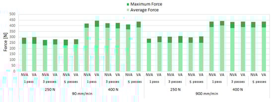 The acquisition and processing of the burnishing forces during all tests confirm that the average preloads that were exerted were around the nominal values of 250 and 400 N (Figure 11). The forces prove to be relatively stable, regardless of the testing conditions. This observation is more clear in the tests performed with the highest feed velocity. For 90 mm/min tests, the maximum force variation is 8%.