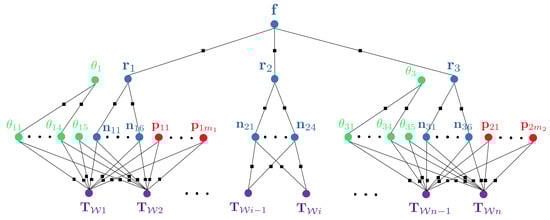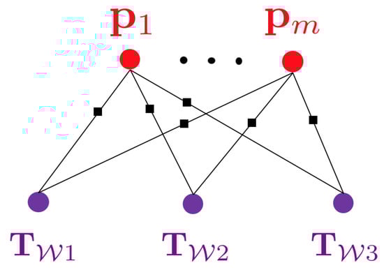 Factor graph corresponding to the example shown in Figure 2. Each factor in the graph (indicated by a black box) represents a residual error from an incidence relationship between measurements and a combination of a camera pose and some object or background geometry related parameters.