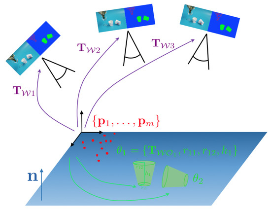 Figure 2 indicates a desktop-scale example in which a camera moves in front of a table on which we have two paper cups and a plant. By using object detections or semantic segmentation results predicted in each view, we would start by defining the representation of the environment as the following set of variables: