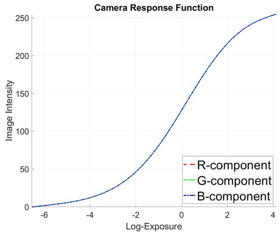 The Camera Response Function (CRF) curve calculated with images of different exposure time in the same static scene.