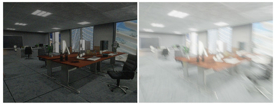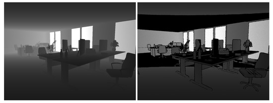 In our case, is normally distributed with 0 mean and a standard deviation of 0.5 (), and . is a virtual horizontal baseline between emitter and receiver, is the focal length in pixels, and is a parameter that tunes the depth noise distance. Figure 9 shows an example of a noisy depth map.