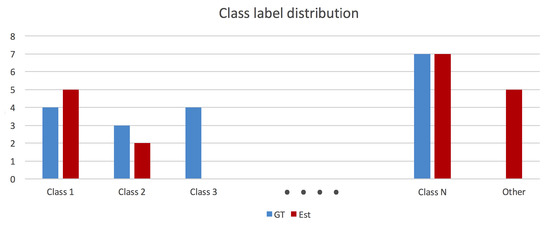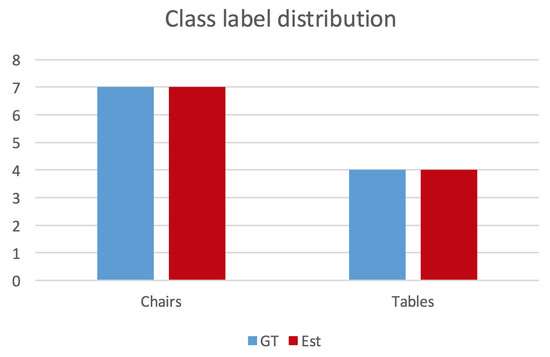 Figure 16 illustrates a map of the ground truth and the detected object centres, and Figure 17 indicates the ground truth and estimated label distributions. As can be observed, the framework has no difficulties with the baseline dataset rm4, in which no object occlusions are happening. The framework identifies the correct label distribution, and all objects are estimated at approximately correct locations.