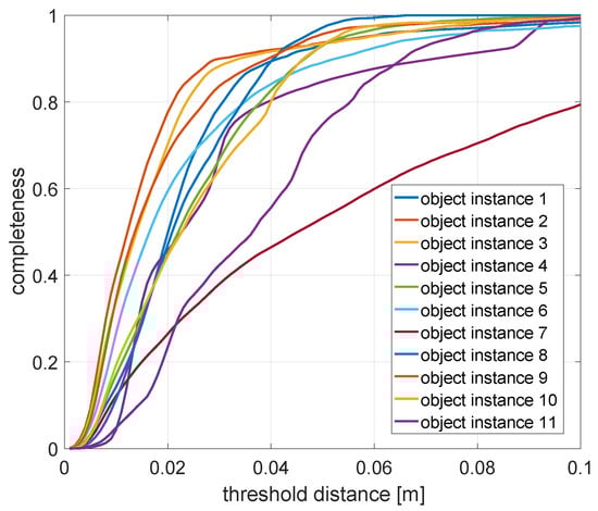 Detailed shape completeness measures as a function of the threshold distance. The area-under-curve serves as a final measure to evaluate the completeness and quality of all 11 object instances.