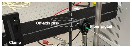 Photo of 6-ply CFRP composite with embedded DOFS. The beam is clamped on the left side in the figure; the off-axis disc to apply strain is hidden behind the specimen (mounted on a vertical rod); the optical fiber pigtail from the laser diode is in front of the specimen.