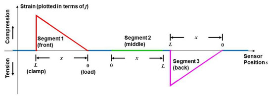 where for Segment i = 1, 2, or 3. Here, and are the inverse functions of Equations (1) and (2), respectively, at all positions between the load and the clamp, where strain is present under steady state conditions and any temperature response normally occurs as a rapidly changing transient (or impulse) at a localized position on the specimen. Based on Equation (2), the component of the frequency shift (in GHz) resulting from strain in the composite is