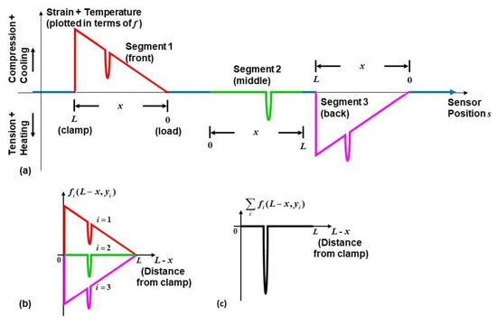 In Equation (6), the measured temperature shift in each segment is assumed for now to be approximately the same through the thickness of the specimen; in other words, is independent of y. Figure 6b,c illustrate the isolation technique graphically, with each segment response and the aggregate response plotted as a function of the distance from the clamp, .