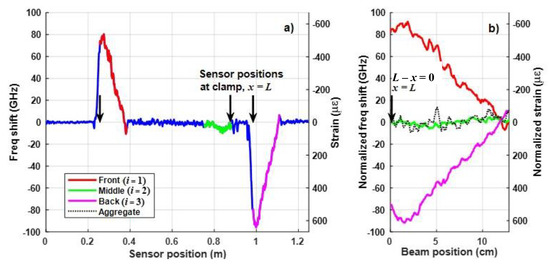The normalized frequency responses in Equation (7), based on the data in Figure 7a, are plotted in Figure 7b, as functions of the beam position (defined as the distance from the clamp) L – x, where red, green and magenta lines are used for Segments i = 1, 2, or 3, respectively. Specifically, the results in Figure 7a are characterized by with maximum and minimum frequency shifts of and that correspond approximately to compressive strain of –535 and tensile strain of 635 με. For these values, the resulting scale factor applied to the data in Segment 1 is so in Equation (8) . This suggests that sensor Segment 3 is ~8% farther from the neutral axis than Segment 1. As implied by Figure 6b, if the isolation technique works properly, the aggregate shift , calculated using Equation (7) and shown by the black dotted line in Figure 7b, should ideally be 0 Hz once strain is canceled and there is no heating. The mean frequency shift in the aggregate response in Figure 7b is 1.13 GHz, corresponding to an average canceled strain of −7.6 με using (2). This aggregate (combined) mean is approximately 28% of the original unscaled mean frequency shift of −4.0 GHz measured on the neutral axis, so the isolation technique was relatively successful at removing the strain response. The standard deviation in the aggregate response is just over 5 GHz.