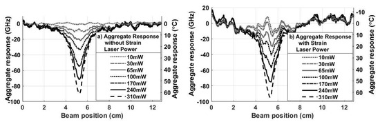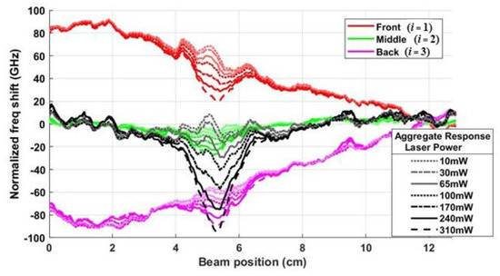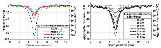 The results in Figure 8 show the temperature responses that should be present, ideally, at each power level if strain were canceled. Using the results from Figure 8 at the 310 mW power level, Figure 9a shows the frequency shift vs. beam position L – x in each of the Segments i = 1–3. The right axis defines the corresponding time-averaged temperature shift . The dashed line in Figure 9a plots the aggregate (amplified) response for the 310 mW laser diode power. No normalization is applied to the aggregate response, since no strain is present. Figure 9b shows the aggregate responses for all seven optical power levels.