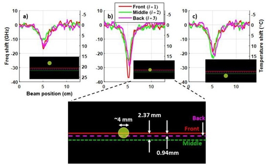 Examples of iterative measurements of frequency and temperature shifts when the ~4 mm laser beam was: (a) 5.27 mm above Segment 1 (front) of sensor; (b) aligned with Segment 1; and (c) 4.73 mm below Segment 1.
