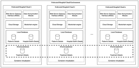 A Data Anonymization Module (DAM) is responsible for hiding the patient’s personal data in electronic health records. This is possible by decoupling the patient’s personal data from electronic health records storing related pieces of information in different databases. To bind the electronic health record with the patient, a patient’s anonymized identification number (patient_id) is generated from the DAM and stored within the electronic health record. Thus, only electronic health records are shared between FHCs, whereas pieces of patients’ personal data are never shared to preserve their privacy. All the produced clinical documentation, including electronic health records, is uploaded on a Cloud Storage containing a patient_id to hide patient’s data. A Blockchain engine is responsible to store information on the Blockchain to certify data non-repudiation and immutability of treatment details guaranteeing accountability and authenticity. The transaction hash resulting from the mining process is stored in the NoSQL document-oriented database as an attribute of the treatment. A local database instance containing both patients and hospital personnel data is isolated from other federated hospitals because these never require to be shared. Treatments’ details are anonymized and stored in a database shared with other participants in the FHC environment. The whole architecture deployed using container virtualization to simplify installation, configuration and maintenance in each FHC.