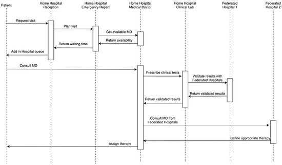 Hospitals belonging to a Federation cooperate ensuring that appropriate therapies and procedures are carried out. Figure 3 shows the sequence diagram describing an example of healthcare workflow including three federated hospitals and where a tele-medical laboratory service is provided. A generic patient who requires a medical visit reaches the emergency room of a home hospital that after evaluating the urgency of the case, identifies an available doctor. At his/her turn, the patient is visited by the assigned doctor who prescribes some clinical analysis such as blood tests which can be done in the home hospital medical laboratory by a biomedical laboratory health technician. If the doctor responsible for the medical laboratory is not available (as the case of small hospital districts) a doctor belonging to the federated hospital (1) validates the results shared via federated Cloud storage. Thence, such a doctor joins the virtual healthcare team along with involved medical personnel of the home hospital. Since the doctor of the home hospital has a doubt the therapy to prescribe, he/she consults a doctor of federated hospital (2) via teleconference. After this consultation, a therapy is assigned to the patient.