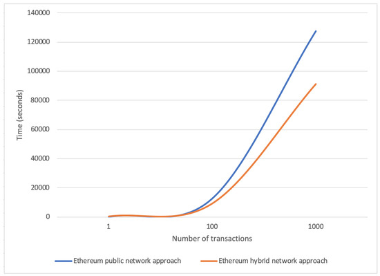 Time comparison for public and hybrid Ethereum network approaches considering a varying number of treatment registration requests.