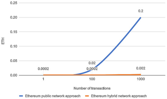 Figure 6 describes a cost comparison in Ether (ETH) for the two approaches. On the x-axis we reported the number of treatment registration requests, whereas on the y-axis we reported the cost expressed in Ether (ETH). From our tests, we appreciated that the average cost of a single transaction (i.e., a simple Smart Contract representing a new treatment memorization or modification) that has to be written in the public Ethereum Blockchain, is roughly 0.0002 ETH. It can be noted that for a small number of transactions there is not a perceptible convenience in preferring the proposed hybrid approach. This is because at least one transaction per day is written in the public Ethereum Blockchain. However, it is clear that the money-saving increases exponentially increasing the number of transactions because only one public transaction every one-hundred of private treatments will be paid with ETH cryptocurrency, resulting in an important cost-saving for the FHC ecosystem.