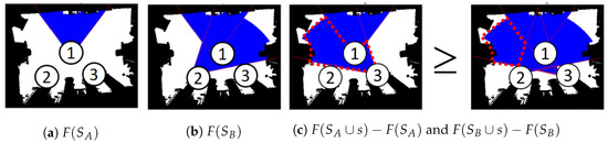 To illustrate the concept of submodularity, an example is shown in Figure 1. There are three ground sets . and represent the selected two sets, respectively. The set means that the sensors are selected at location 1 and 2. and mean the coverage of sensor at location 1 and (see Figure 1a,b), respectively. The submodular gain of and after adding a set is represented by the red dashing lines (see Figure 1c). It is obvious that the coverage function satisfies the diminishing return property. In other words, the objective function of maximizing coverage is submodular. Greedy approaches can generate near-optimal solutions even if this is an NP-hard problem [4,7].