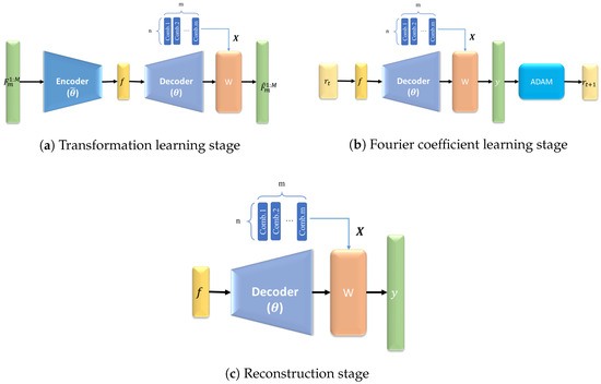 Since the network structures of the Fourier coefficient learning and reconstructions stages are similar to that of the transformation learning stage, the network structures of the transformation learning stage are explained as follows (see Figure 9): This stage includes an autoencoder, weighting networks (W), and combinational networks. The autoencoder is implemented by two network structures, a fully connected neural network (FCN) and a convolutional neural network (CNN).