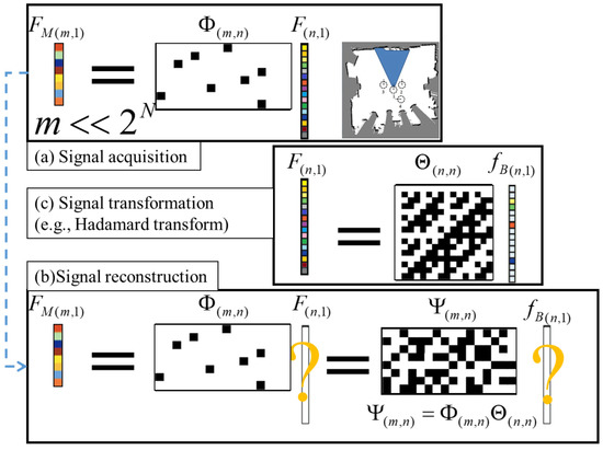 Illustration of the compressed sensing concept [3]. (a) is collected by the system after taking measurements from a signal . The color cells represent real values and black/white cells represent binary values (0 and 1 in while 1 and −1 in .) (b) The system has and tries to recover . (c) The signal F is sparse in the Fourier domain. In this example, m is 8, n is 16 and k is 4. Given and , it’s impossible to recover (). But, given and , can be recovered ().