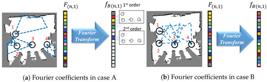 As Figure 4 shows, there are two cases of set configurations. There are four sets (e.g., sensors) in the environment. The number of submodular function values is . The order of set is defined as the number of selected sets. The number of order terms is , where N is the total number of sets. Hence, the numbers of 0th, 1st, 2nd, 3rd, and 4th order terms are 1, 4, 6, 4, and 1, respectively. In case A, only sets 2 and 3 have sensing overlapping. Hence, only of the 2nd order terms is non-zero. There is no overlap between the third and fourth order sets, so the Fourier coefficients of 3rd and 4th orders are zero. Therefore, the number of non-zero coefficients in case A is . In case B, there is sensing overlapping between all sets, Hence the number of non-zero coefficients in case B is . This example demonstrates that utilizing the overlapping relationship can dramatically reduce the number of Fourier basis from to polynomial numbers if there are a few sensing overlaps between sets.