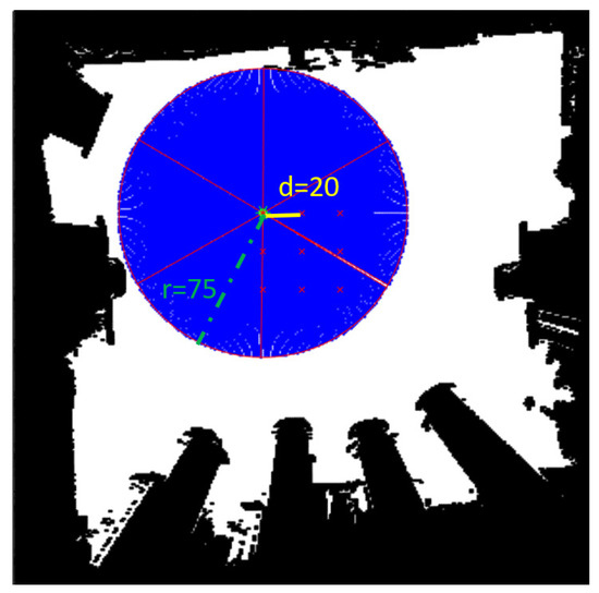 The subgoal configuration in the experiment. The red points represent the subgoal locations. The black and white grids represent the occupied and unoccupied grids, respectively. The blue areas and red lines represent the areas covered and field of view, respectively. The sensor-covered radius is 75 and the distance between subgoals is 20.